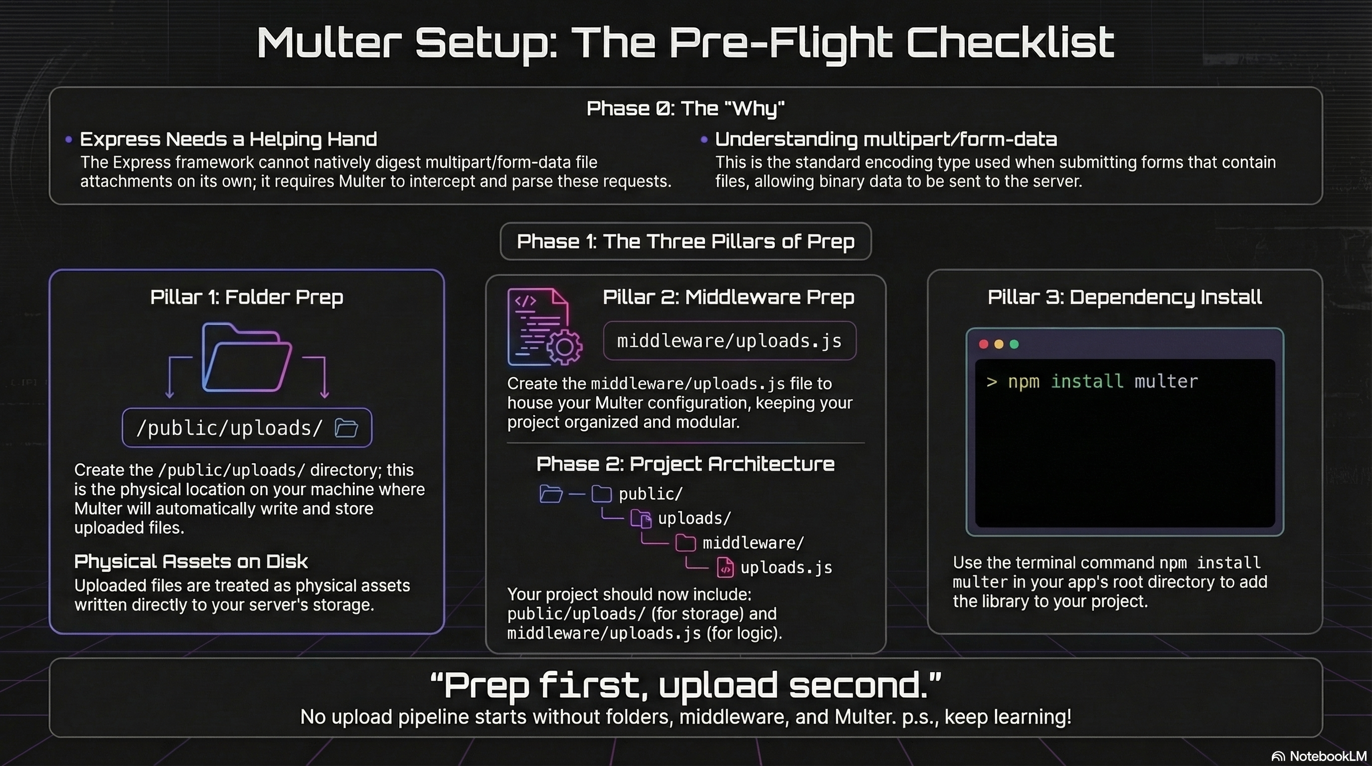 Section titled “⏭ Next: Configure Multer”With the package installed and our folders ready, let’s configure Multer to receive, store, and process the files.